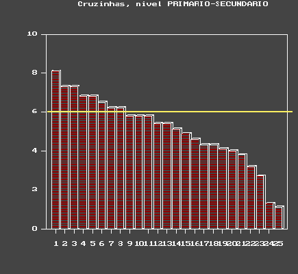 O outro lado da moeda é a formação dos professores. O gráfico abaixo mostra o desempenho ( em nota de 0 a 10 ) dos formandos do Curso de Licenciatura da UFRGS nas questões objetivas de matemática de nível de ensino primário e secundário no Provão do MEC 1998. Sendo que este curso foi classificado pelo MEC como entre os melhores do país, só podemos ficar imaginando o que teria sido o desempenho dos outros cursos: