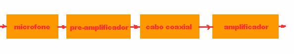 Entende-se, acima, que a entrada e a saída são grandezas de mesmo tipo ( por exemplo duas potências, ou duas voltagens, ou etc ) e expressas na mesma unidade de medida ( por exemplo: ambas em watts, ou ambas em volts, etc ). exemplo Ao girarmos o controle de volume de um toca-discos, o output aumentou de 0.5 w para 10 w. Qual o ganho em dB ? Interprete. Solução: ganho = 10 log ( 10 / 0.5 ) = 13 dB, ou seja a nova saída = 101.3 = 20 vezes maior do que a inicial. exemplo Os sinais de radio de um avião tinham 1 mw de potência e chegaram à antena do aeroporto enfraquecidos de 58 dB. Sendo que o sistema de radio-recepção do aeroporto amplificou esses sinais para 2 w, pede-se o ganho do sistema antena do aeroporto + amplificador do aeroporto . Solucao: o leitor deve ter cuidado ! A perda de 58 dB é uma valor negativo, ou seja ( indicando por ant o sinal captado pela antena): - 58 = 10 log ( ant / 0.001 ) , e daí: ant = 0.001 * 10 -5.8 = 1.58 * 10 -9 de modo que:ganho no aeroporto = 10 log ( 2 / ant ) = 91 dB ou seja, o aeroporto foi capaz de amplificar cerca de um bilhão de vezes o sinal que captou do avião.exemplo No sistema eletrônico abaixo, temos: perda do microfone = -3.5 dB, ganho do pre-amplificador = 12.5 dB, perda do cabo = -6.5 dB e ganho do ( amplificador + alto-falante ) = 37.5 dB: