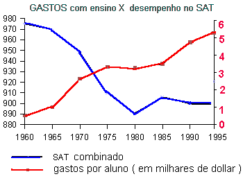 Uma primeira consequência desta massificação é a dificuldade de se conseguir professores habilitados, especialmente na área das ciências exatas. Contudo, nossa preocupação é com outra faceta da massificação. Ela vem fazendo que cheguem à escola alunos e professores cada vez menos capazes e com cada vez menor interesse acadêmico. Com eles, os métodos e padrões clássicos de ensino não mais funcionam. Examinemos isso usando o gráfico abaixo, o qual compara a evolução do desempenho dos alunos americanos no SAT ( =Scholastic Aptitude Test, que corresponde em natureza e finalidade ao nosso ENEM = Exame Nacional de Ensino Médio ) com o aumento nos gastos com ensino:
