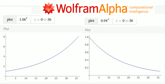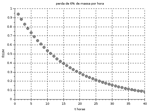 Exemplo 2: Uma amostra de potássio radioativo 42, que inicialmente tem M gramas, perde 6% de massa a cada hora t que passa. A massa f(t) que resta após t horas é dada por f(t) = M bt , onde b=1-0.06=0.94.