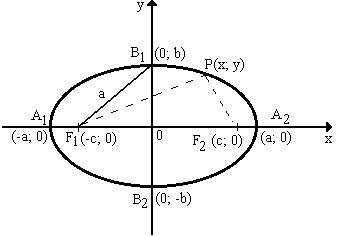 P(x, y) um ponto qualquer de uma elipse e sejam F1(c,0) e F2(-c,0) os