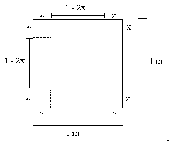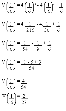 | Para fazer o esboço do gráfico da função volume da caixa, primeiro verificamos quais são as raízes da função, vemos que as raízes da função são: 0 e 1/2(raiz dupla). Com isso sabemos que a função corta em x=0 e tangencia o eixo OX em x=1/2. Agora só falta vermos o que acontece entre as raízes e fora delas. Para x negativo V(x) é negativa, entre as raízes ela é positiva, e depois de x=1/2 também. Agora fica fácil traçar o gráfico ao lado: | ![]() |